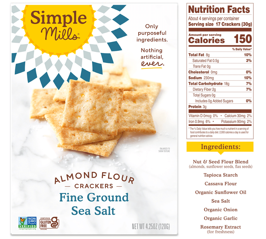 Simple Mills crackers contain 2g of fiber per 30g serving (17 crackers) and list “nut & seed flour blend” as the first ingredient.
