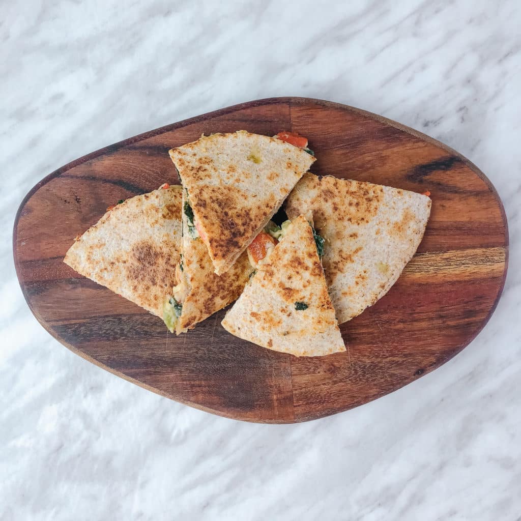 This recipe uses only 6 ingredients which keeps this meal simple. We love the idea of adding greens to quesadillas because they shrink down to almost nothing and allow you to add tons of veggies without having issues with the quesadilla sticking together.