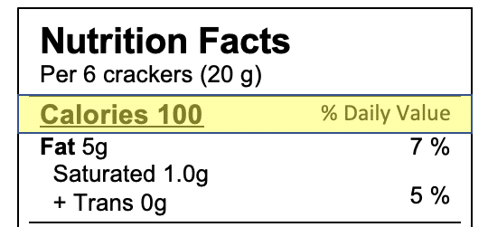 Before we get into the rest of the numbers, let’s review the percent daily value. The percent daily value (or % DV) is a tool on the nutrition facts table aimed to help simplify label reading for consumers. The percent daily value represents the percent of daily nutrient needs for the average Canadian consuming a 2000-calorie diet. For example, the label below contains 7% DV of fat, meaning that one serving of crackers provides 7% of your daily fat needs.
