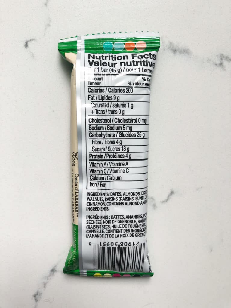 LARABARs are a healthy on-the-go snack. Nutritionally speaking, they contain a good balance of carbs, protein, and fat for a snack that will keep you satiated between meals. We also love the short list of whole-food ingredients used to make LARABARs. While LARABARs do contain 15-24g of sugar, it’s important to note that LARABARs contain no added sugar. The sugar content in LARABARs comes from dates, and fruit in some flavours. To put this into perspective, this amount of sugar is equivalent to 3-4 whole dates, or 1 small apple, which is an appropriate portion size to enjoy as a snack.