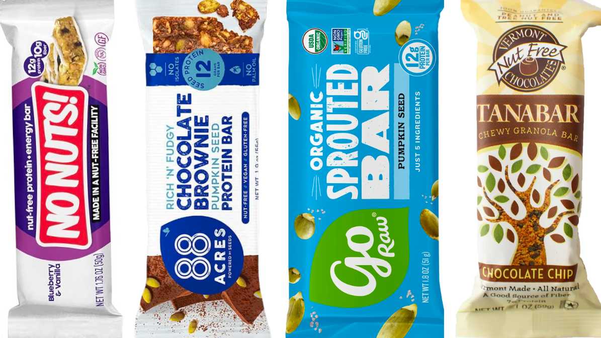 No Nuts! Protein bars are made in a nut-free facility and are available in four flavors: Chocolate Chip, Lemon Creme, Blueberry & Vanilla, and Chocolate Caramel Mocha. Each has 12g of protein per bar. Shop them on the No Nuts! website.